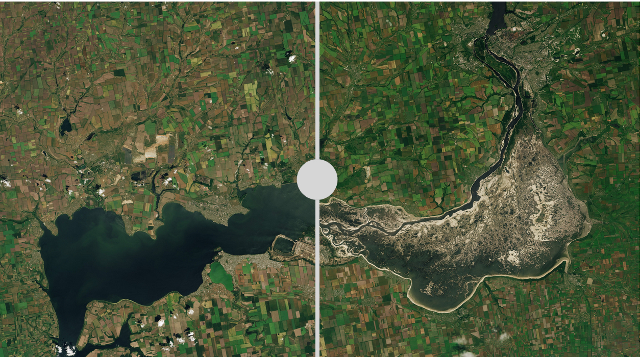 Satellite images of the Kakhovka Reservoir in June 2022 (left) and June 2023 (right), after the Kakhovka dam was destroyed. NASA