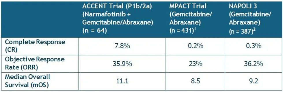 Amplia Therapeutics Limited (ASX: ATX), (“Amplia” or the “Company”), announces mature data from the ongoing ACCENT clinical trial in advanced pancreatic cancer in which the Company’s lead drug narmafotinib is combined with chemotherapy showing a median overall survival of 11.1 months, and five complete responses recorded to date.
