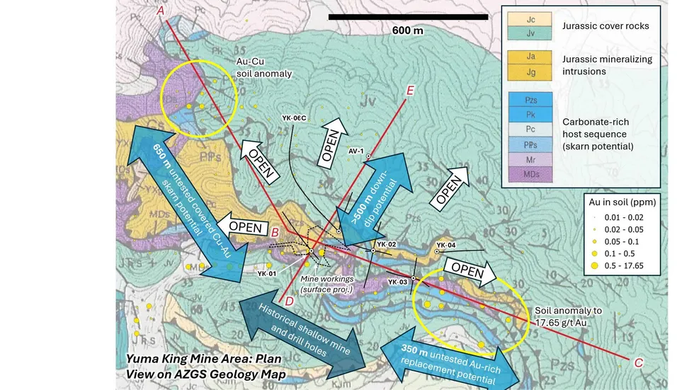 Holes YK01-A, YK01-B, YK01-C, and YK01-D were located up-dip of the Yuma King mine, and hole AV-1, collared approximately 365m northeast of the historical mine workings, intersected the down-dip extension of the mineralization (Figure 3), demonstrating at least 500m of down-dip skarn potential. Dolomite, dolomite skarn, and marble skarn are the primary hosts of the copper and gold mineralization and are cut by moderately Cu-Au-Mo mineralized Jurassic porphyritic intrusions.