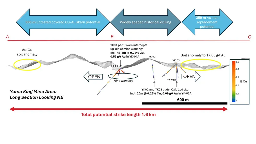 “The historical drilling at Yuma King demonstrates the strength and continuity of the copper-gold skarn system, with multiple holes intersecting broad zones of mineralization near the historical mine and extending over 760 metres to the east,” commented CEO, Jon Ward. “Importantly, the work completed to date provides us with a strong foundation as we refine our upcoming drill program that will focus on testing extensions of the known skarn horizons with a potential strike length of 1.6 km, as well as related porphyry Cu-Au-Mo mineralization. The next phase of exploration at Yuma King will further unlock the broader potential for our shareholders.”