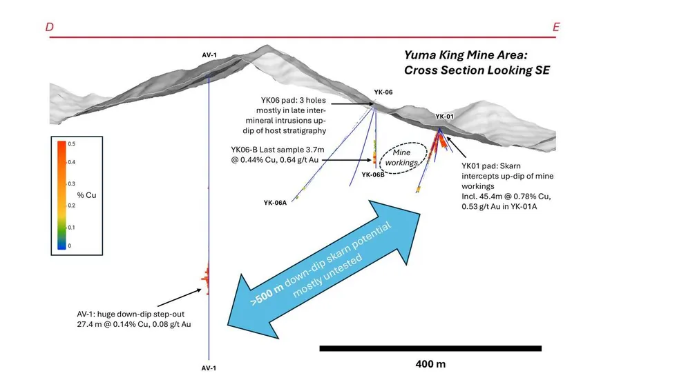 - 27.4 metres of 0.14% Cu, 0.08 g/t Au, and 1.1 g/t Ag from 344.4 m in hole AV-1, a ~400m down-dip step-out from the historical Yuma King mine
