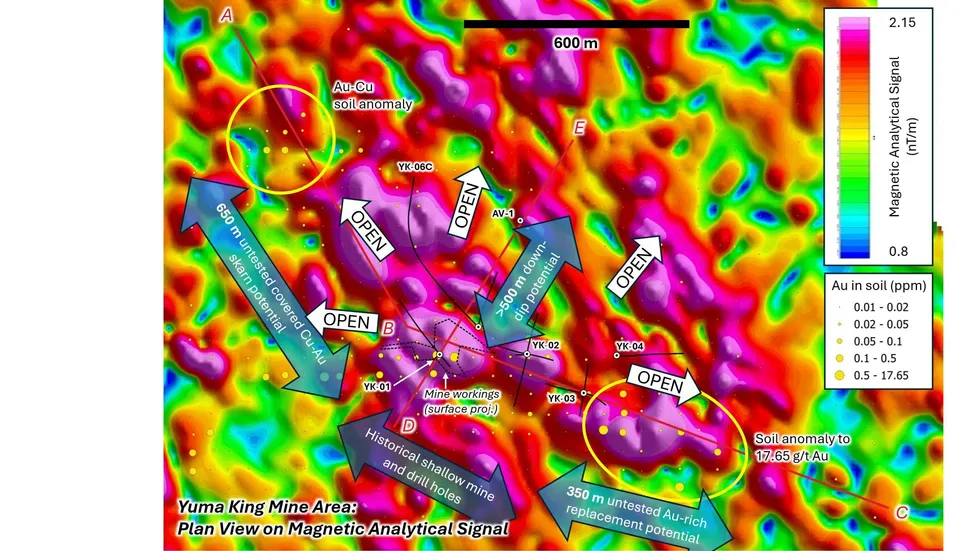 The purpose of the planned upcoming drill program will be to confirm and extend the copper and gold mineralization in and around the Yuma King Mine area. Post-mineral deformation including fold repetition of the mineralized skarn-hosting units, and structural cover of these units, may have hidden compelling exploration targets. Some of these are highlighted by recent drone magnetic surveys which have the potential to image magnetic skarn mineralization (Figure 4; Corcel Exploration New Release July 28, 2025). Recent surface sampling has outlined Au in soil anomalies (Corcel Exploration News Release May 13, 2025) which point to further strike potential in the Yuma King mine area (Figures 1, 2, and 4).