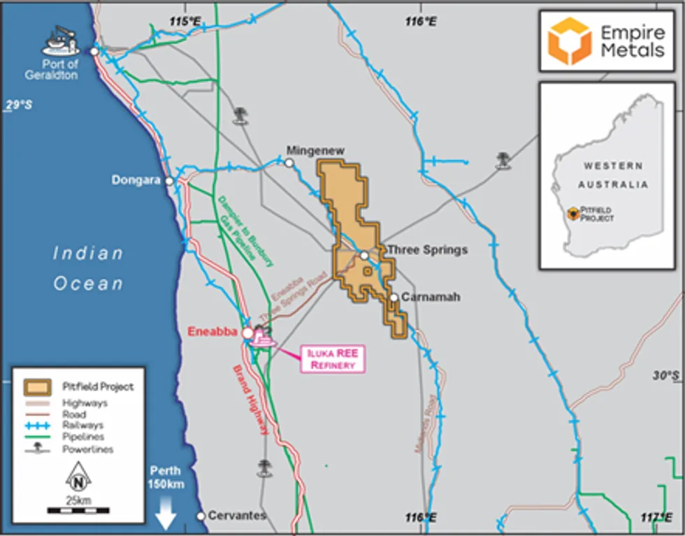 Empire Metals Ltd (AIM:EEE)(OTCQX:EPMLF) is an exploration and resource development company focused on the rapid commercialisation of the Pitfield Titanium Project, located in Western Australia. The titanium discovery at Pitfield is of unprecedented scale, and hosts one of the largest and highest-grade titanium resources reported globally, with a Mineral Resource Estimate (MRE) totalling 2.2 billion tonnes grading 5.1% TiO₂ for 113 million tonnes of contained TiO₂.