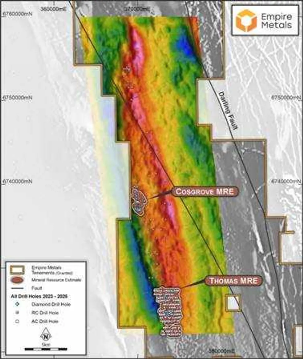Table 1 below summarises the MRE for Pitfield’s Thomas and Cosgrove deposits effective as of 13 October 2025 on a 100% basis. Empire owns 70% of Pitfield in a Joint Venture (JV) with Century Minerals Pty Ltd, which holds the remaining 30% JV interest. Empire is manager of the JV and the sole operator of the Project. Snowden Optiro was engaged to prepare a geological resource model for the MRE for Empire on the Pitfield Project. The MRE was reviewed and signed off in accordance with the JORC Code (2012) by Andrew Faragher (MAusIMM), Exploration Manager for Empire.