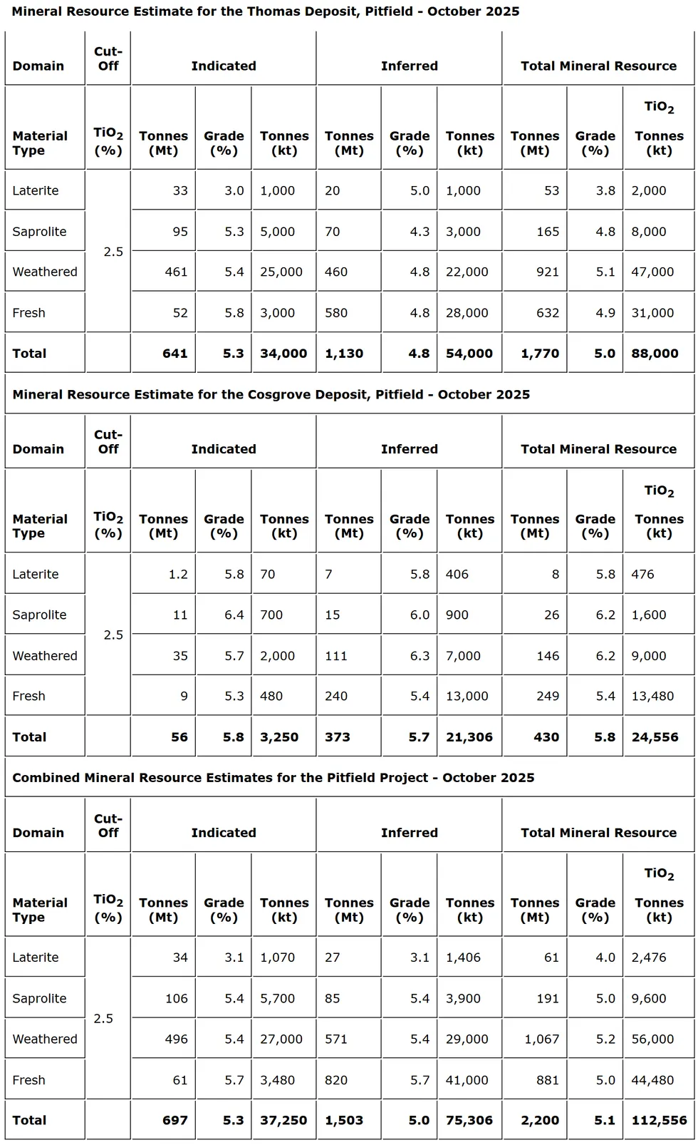 The MRE, which covers only the Thomas and Cosgrove deposits, includes a weathered zone resource of 1.26 billion tonnes at 5.2% TiO₂ and a significant Indicated Resource of 697 million tonnes at 5.3% TiO₂, predominantly from the Thomas deposit. Titanium mineralisation at Pitfield occurs from surface and displays exceptional grade continuity along strike and down dip. The MRE extends across just 20% of the known mineralised footprint, providing substantial potential for further resource expansion.