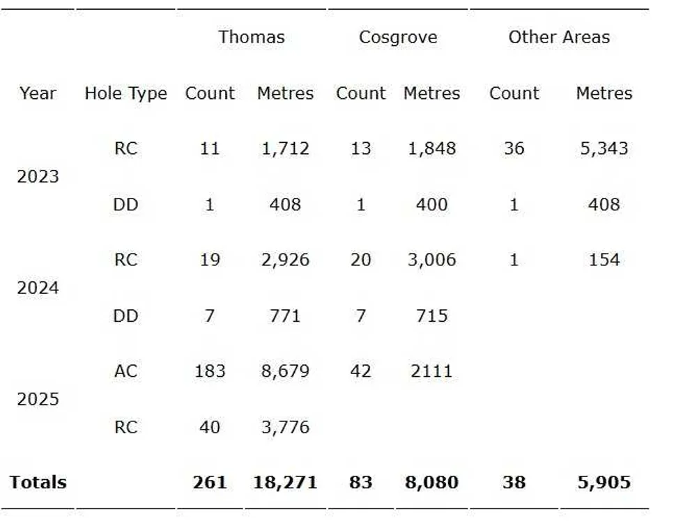 The MRE has been completed on the Thomas and Cosgrove Deposits, which are located approximately 10km south-west and north-west of the town of Three Springs respectively. The Thomas Deposit has significantly more drill holes then the Cosgrove Deposit, due to the extensive drilling programme that was completed there in July 2025 (announced 8 July 2025). The greater drilling density at Thomas has resulted in a far larger MRE at Thomas than at Cosgrove, however further MRE grid drilling (AC/RC) is planned at Cosgrove over the next six months. Further infill MRE drilling at the Thomas Deposit (AC/RC) is scheduled for Q1/Q2 CY 2026 with drill holes to be drilled on existing cleared track lines within native vegetation areas under a standard clearance permit, while diamond drilling is scheduled in Q4 CY 2025 at Thomas focused on metallurgical and geotechnical work.