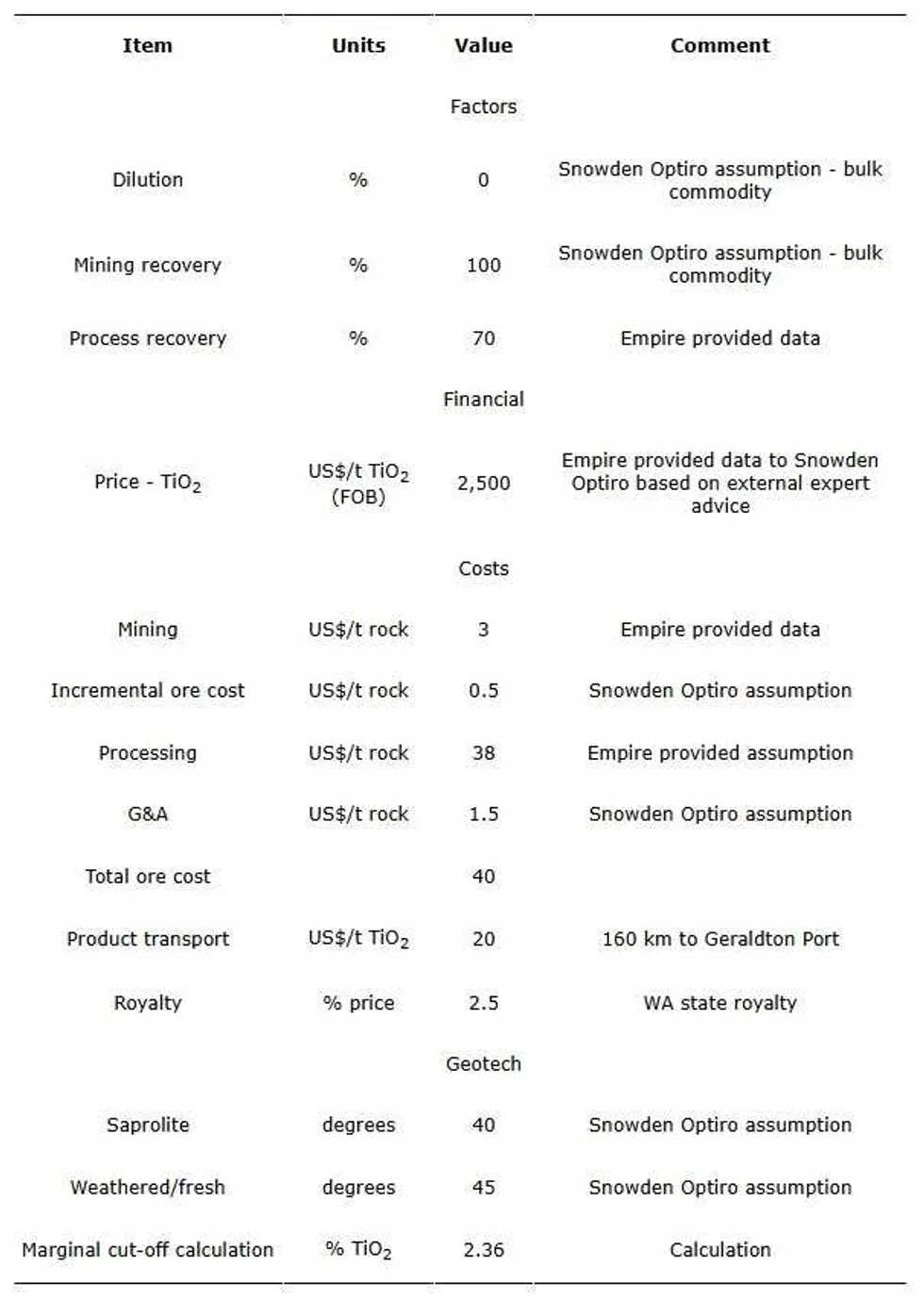 A cut-off grade of 2.5% TiO2 was used and determined from optimisation studies which indicated a break-even cut-off of 2.36% TiO2. Grade and tonnes have been reported within a constrained pit shell reported from a Whittle optimisation. The underlying parameters are listed in Table 4.