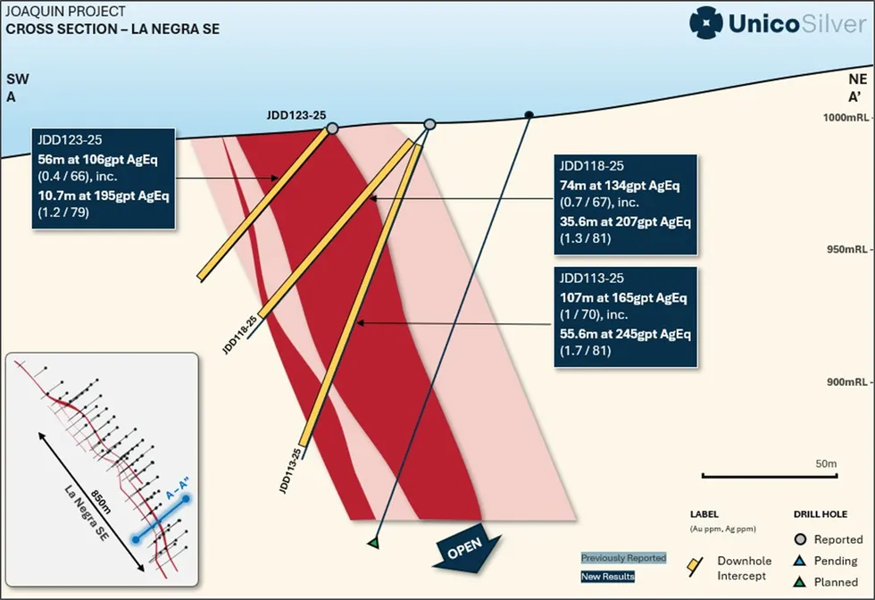 “Infill drilling at La Negra SE continues to deliver wide, shallow zones of oxide silver-gold mineralisation with excellent continuity across the full 850-metre strike length. These results confirm the scale and geometry required for conventional open-pit development and support our decision to move directly to a Pre-Feasibility Study Mineral Resource Estimate.