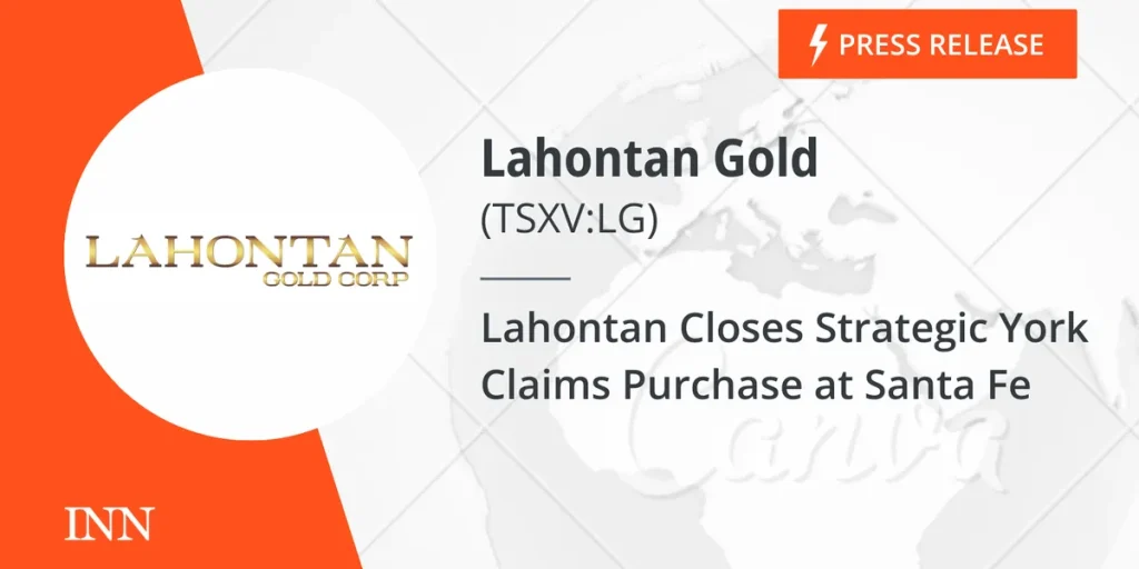 Lahontan Gold Corp. (TSXV:LG)(OTCQB:LGCXF)(FSE:Y2F) (the “Company” or “Lahontan”) is pleased to announce that the Company has completed the Purchase (the “Purchase“) of 27 unpatented lode mining claims (the “York claims“) from Emergent Metals Corp (“Emergent“). The York claims are contiguous with the southeast corner of the Santa Fe Mine Project and provide a compelling opportunity to significantly expand oxide gold and silver mineral resources previously defined at the York deposit*. Modeling of drill data during the mineral resource estimation process suggests that gold and silver mineralization likely extends onto the York claims. This targeting concept was in part validated by Lahontan’s recent drilling campaign where reverse-circulation drill hole YOR25-001R cut 89.9 metres (45.7 – 135.6m) grading 0.23 g/t gold (please see Lahontan Gold News Release dated September 2, 2025). The Company is currently planning additional drilling at the York target area for this Fall. With the addition of the York claims, the Company now owns or controls 415 unpatented lode mining claims, 67 unpatented millsite claims, and 24 patented lode mining claims encompassing over 2,832 ha or 28.3 km2 of mineral rights in one of the World’s premier gold belts: Nevada’s Walker Lane.
