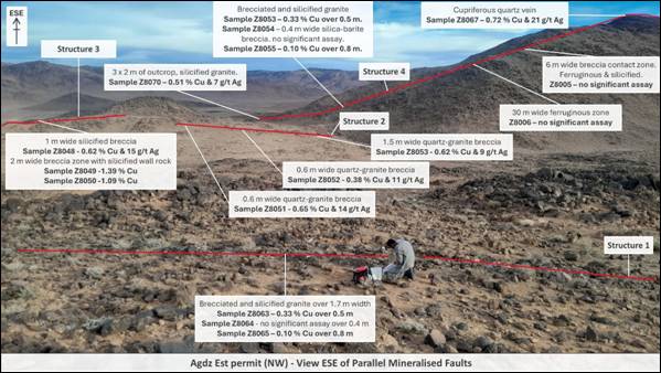 The results identify multiple mineralised fault zones hosting copper and silver, significantly extending the known footprint of mineralisation within the broader 50.4 km² Agdz Project (“Agdz“) area. The identification of these multiple mineralised structures over a limited area highlights the potential scale of the system and materially enhances the Company’s confidence in advancing Agdz towards drill evaluation.