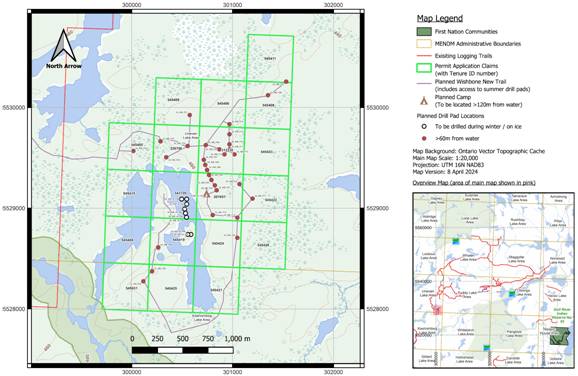 Figure 5: Wishbone Exploration Permit PR-24-000022 Permitted, Claim Cells, Drill Pads, Camp and Access |