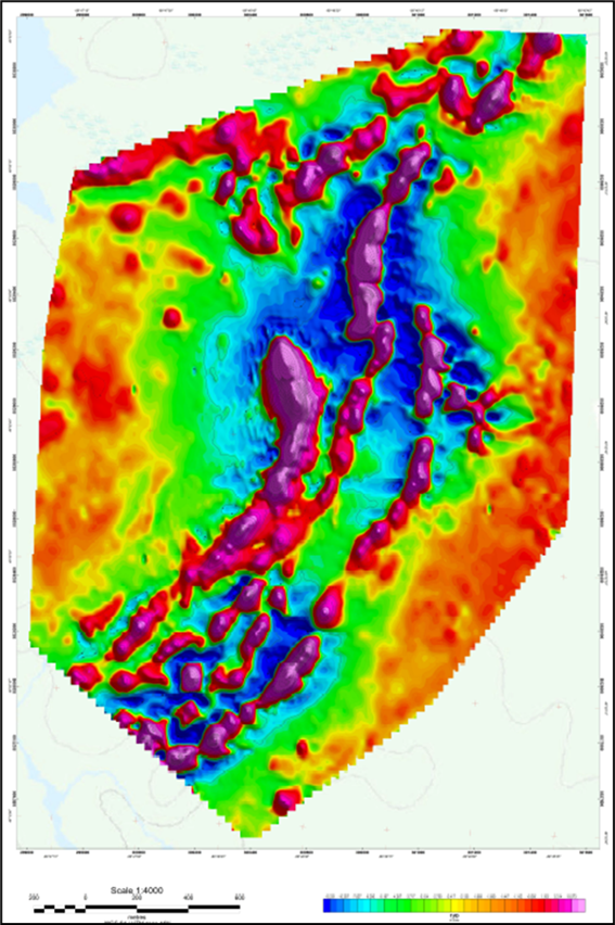 Figures of the magnetics inversion and structural model are set out below in Figures 1 and 2, whilst the map the processed First Vertical Derivative of the Magnetic Survey data is shown in Figure 3. Figure 4 shows the highly anomalous copper in lake and stream sediments which are located above, and which drain off the site of the Wishbone VMS Prospect. Details of the Magnetic Survey are provided in Table 1.