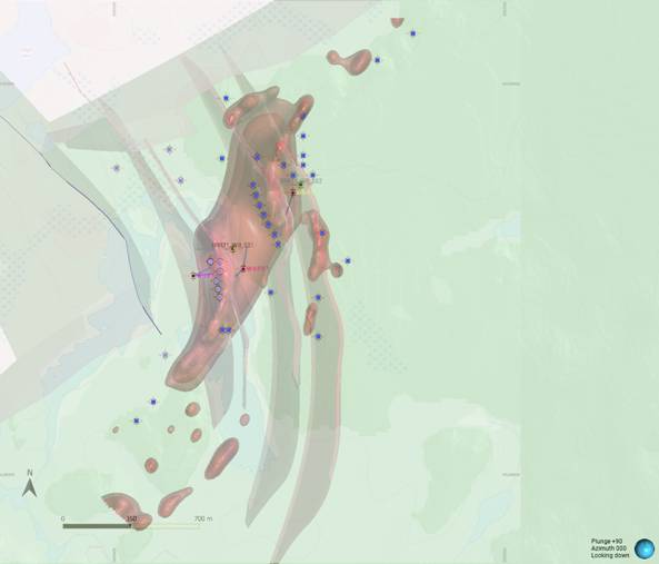 Figure 1: Plan view of modelled Wishbone VMS Target showing magnetic inversion model, geological contacts and location of Panther diamond drillholes (based on magnetic inversion model shells). Notes: Scale bar and north arrow in bottom left corner of figure. Coordinates stated in UTM Zone 16N NAD 83 datum. Image highlights the size of the modelled magnetic body at depth. Dark blue dots signify permitted drill pad locations. The figure is overlain by a semi-transparent surface rendering of the topographical map, from which the trace of the Wishbone Lake can be discerned (light blue). The green block model below the topography reflects the greenstone volcanic geology, the beige block model to the north is granitoid. The granitoid/volcanic contacts are interpreted to be faulted. A series of three concave fault/contacts are currently interpreted to dissect the magnetic inversion model. The down-hole traces of Panther’s 2021 and 2022 drilling are shown in plan view. The working model is dynamic and will be updated as the 2026 work programme develops. |