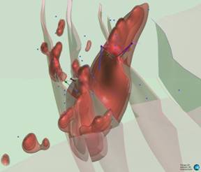 Figure 2: Series of oblique three-dimensional views of modelled of modelled Wishbone VMS Target showing location of Panther diamond drillholes (based on magnetic inversion model shells). Notes: Image highlights the size of the modelled magnetic body at depth. Blue dots signify permitted drill pads. For relative scale and description of other features please see the notes below Figure 1. |