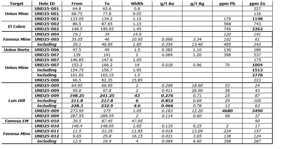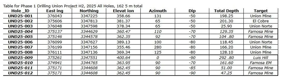 While the results from the Famosa Targets and Luis Hill were disclosed in the 2026-Jan-12 News Release, Table 2 discloses the full results from the 2025 program, with the previously drilled holes highlighted in yellow. Hole 3 is not shown as it is aborted early due to poor drilling conditions, it was redrilled as hole 6 to test and hit mineralization in the target area initially planned for hole 3. Further drilling at Union Norte can be pursued and is recommended for both CRD and SDHG targets.