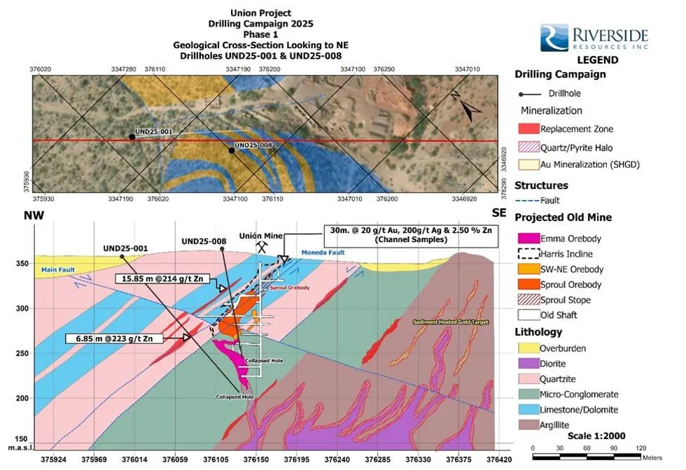 “Riverside is excited by the high grade of 600 gram-metres gold and 6,780 gram-metres silver represented by the 30 metres of continuous chip channel sampling from the Union Mine area,” said John-Mark Staude, President and CEO of Riverside Resources. “These results, together with the completed Phase 1 drill assays from Union Mine, Union Norte and El Cobre, reinforce that drilling is intersecting the types of CRD-style alteration and multi-element signatures we were targeting, including anomalous zinc, silver, gold and lead consistent with the historic mining district and also finding sediment-hosted gold (“SHGD”) indicators is a key development in progressing the Union Project and supports the technical rationale for aggressive follow-up work in 2026.”