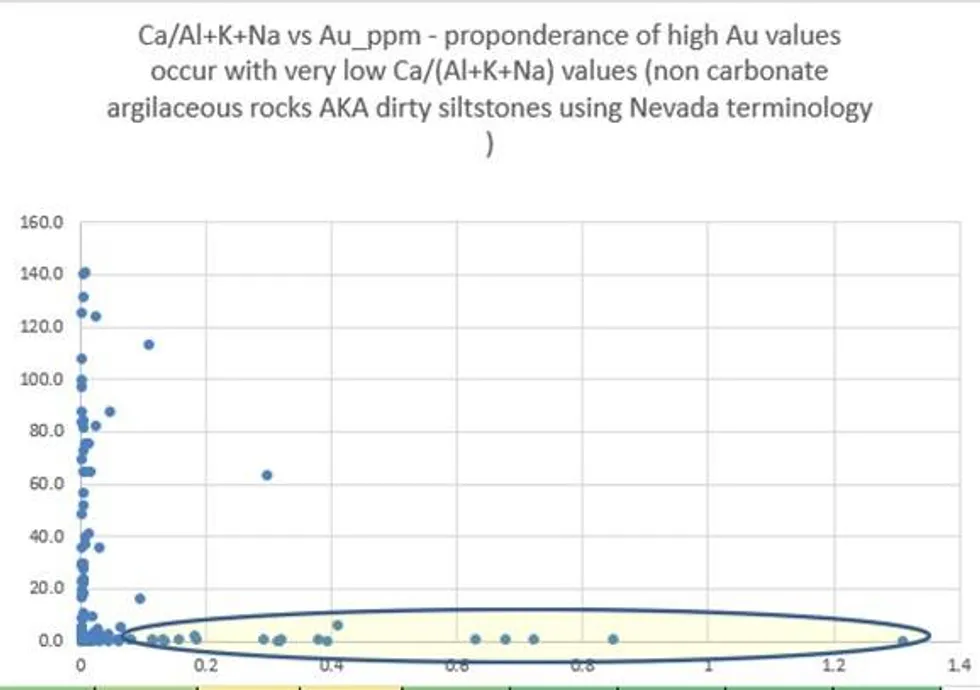 Figure 3: Gold with high Al + K + Na, meaning not with the dolomite and limestone for the sediment-hosted gold aspects like Nevada. Carlin geochemistry for the Luis Hill Hole 9.
