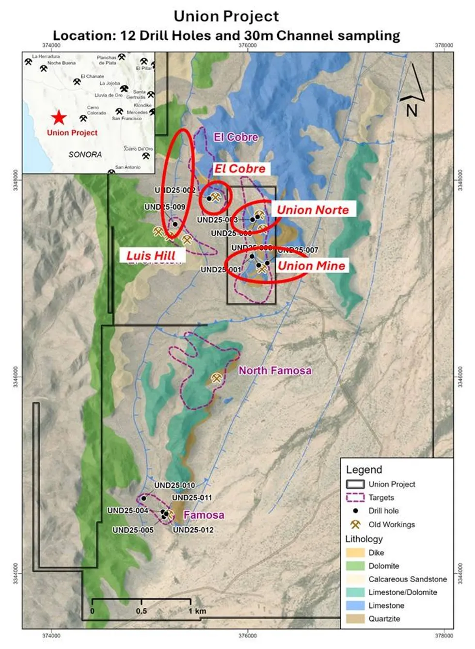 The location of all 12 drill holes from the 2025 Phase I programs are shown in the drill plan (Figure 3), with the channel sampling area and the Union Mine, Union Norte and El Cobre target areas highlighted.