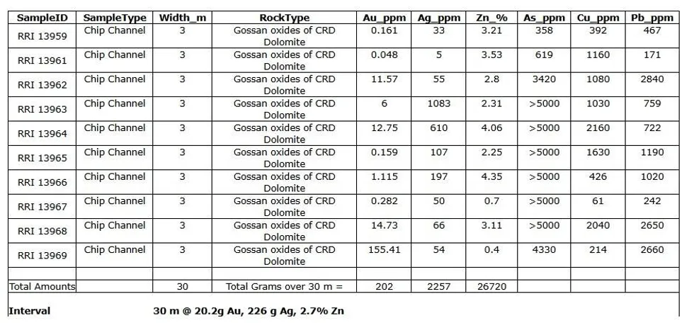 Table 1: Full 30m channel sampling results with the interval. For reference, using a 24 m continuous subset of the channel interval, the average weighted grade is 25 g/t gold and 290 g/t silver. The sampling is oblique to strike.