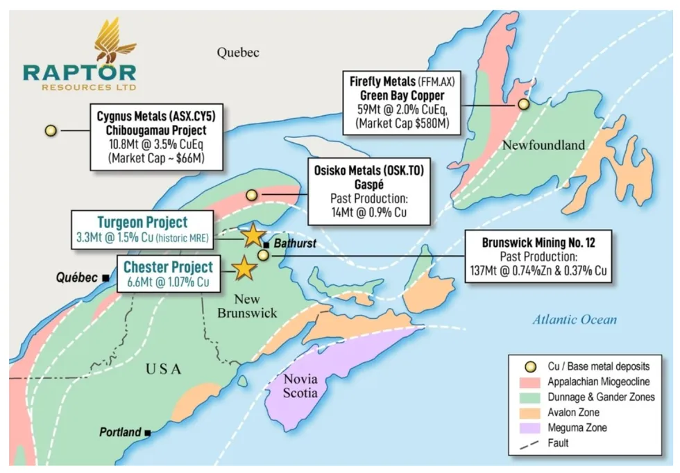 Its flagship Chester Project, in which Raptor holds 100 percent interest, lies within the Tier-1 Bathurst Mining Camp—a prolific VMS district that has historically produced over 475 Mt of base metals across more than 46 deposits, including the world-famous Brunswick No. 12 mine. Chester already hosts a JORC 2012 MRE of 6.685 Mt at 1.07 percent copper from surface, underpinned by high-confidence Indicated resources and significant polymetallic credits.
