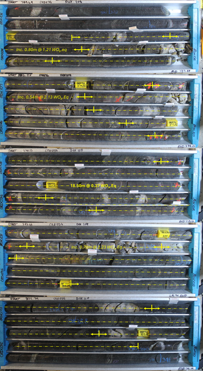 - 0.80m @ 1.02% WO3, 0.09% Sn & 0.45% Cu (1.21% WO3.Eq) from 372.50 m