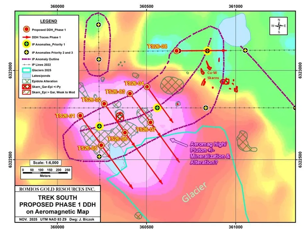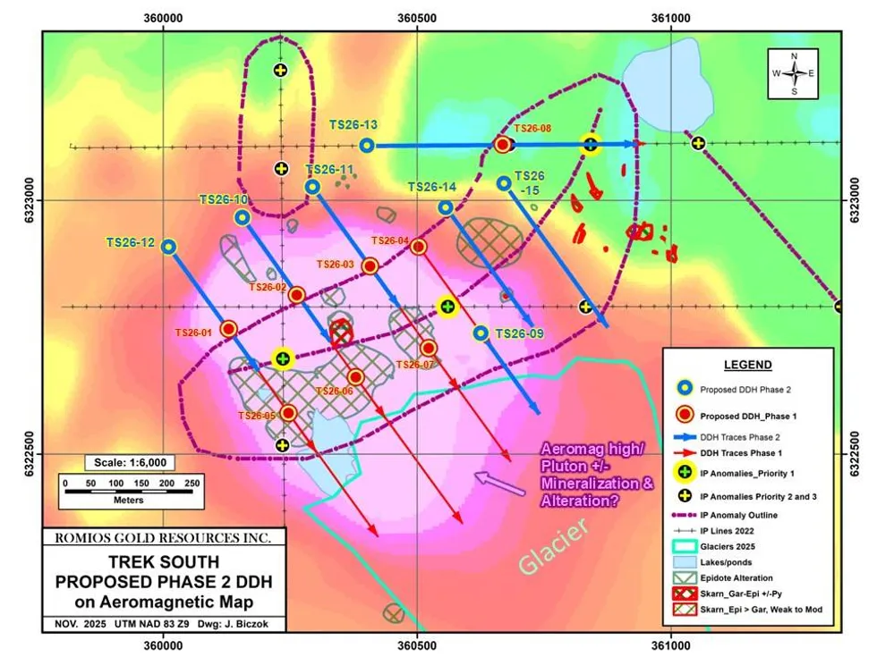 A restructuring process has been underway at Romios for the past half-year. This process culminated at an Annual General and Special Meeting (AGSM) of the Company held on January 16, 2026, results of which were announced on January 19th, 2026 (Click here). The purpose of this restructuring effort has been to improve the Company’s market appeal, such that it is better positioned to raise the new capital required to complete the initial phases of drilling at the Trek South prospect recommended by the Technical Report. A broad range of geosciences applied to the Trek South prospect in the period since 2021 including mapping, sampling, magnetic, IP and MT geophysical surveys, have delivered high-order, complementary results that all vector to the same conclusion: that the target area offers high discovery potential.