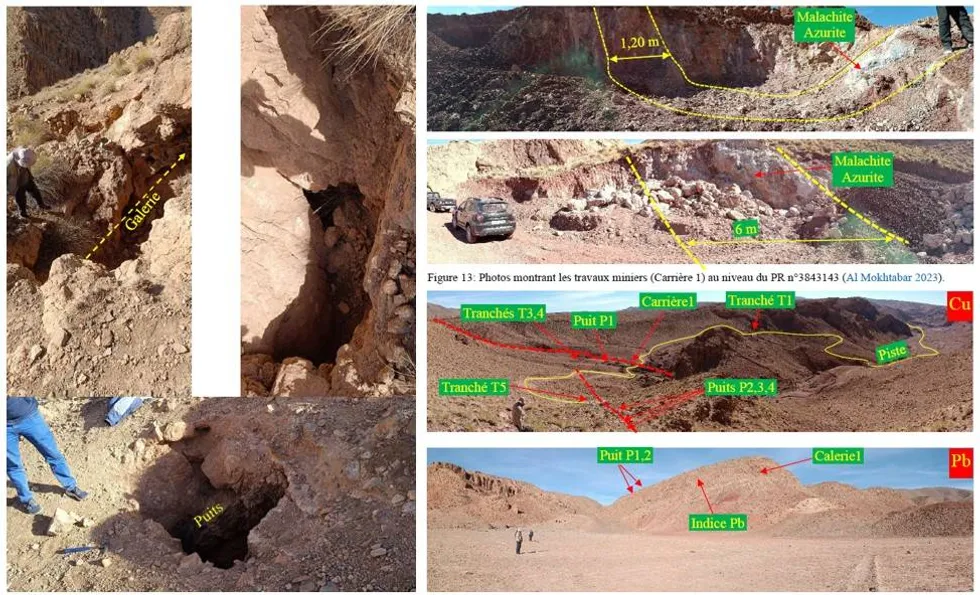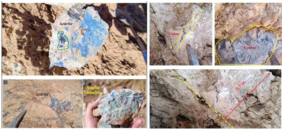 The veins on the project area exhibit thicknesses ranging from approximately 0.50 to 4.00 m. According to their orientation, the strike of these vein structures ranges from NE–SW to NNE–SSW. During the most recent field visits, a set of copper and lead indications were identified within the carbonates and along the major regional fault of Tizi n’Test all hosted within the same marly to marly‑sandstone facies. A number of these occurrences have been subject to exploitation (artisanal mining) of varying duration. See Figures 5 and 6. The steeply-dipping veins exhibit characteristics consistent with known copper-lead-silver veins throughout the mining district.