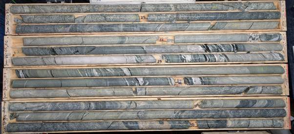 Figure 2 boxes of core from a drill hole drilled on the new azimuth of 110o, showing the potentially mineralised ‘package’ of altered (variously quartz veined) tonalite on the margins of deformed chloritic schist containing / alternating with quartz veins and veinlets.
