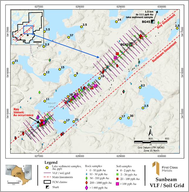 The lineament that the Roy occurrence / development is located on is a district scale structure and has now been traced through historic work and EGS prospecting towards the 111ppb lake sediment sample some 5km northeast along strike of the mine shaft. The structure also hosts historic shafts B43 and B45, which further enhances the potential (see Figure 1).