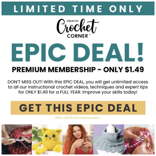 Wow! Have you been wanting to learn how to crochet? If so, don’t miss this HOT deal to get a premium annual membership to Creative Crochet Corner for just $1.49! Plus, stay on the page for a few seconds and you’ll receive a pop-up offering this for ONLY $0.75!